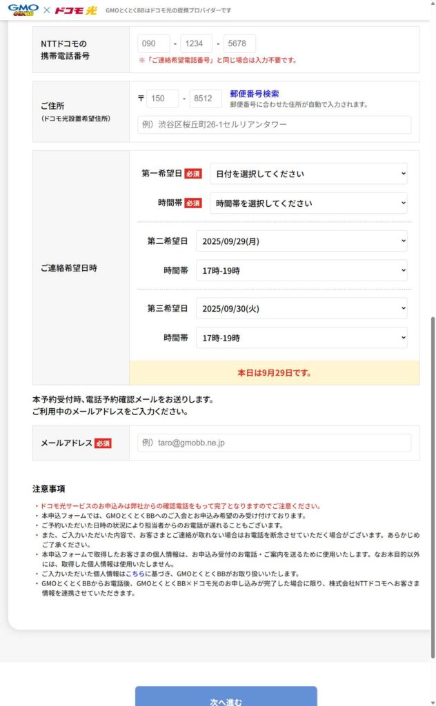 ドコモ光のお申込みは、後日ご連絡希望日時に